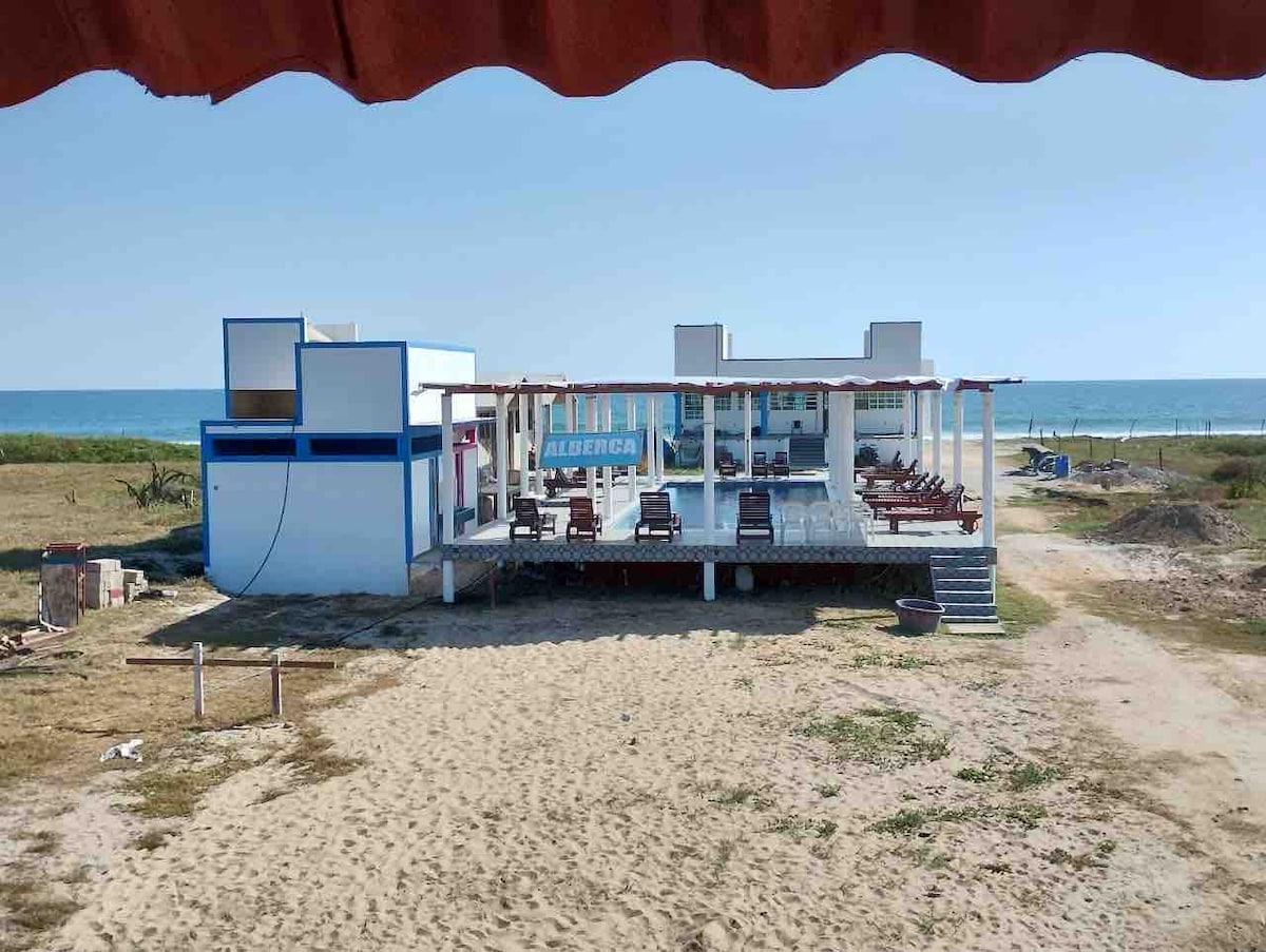 Casa sobre la playa, mas de 20 metros de playa solo para ti, podrás ver los mejores atardeceres y en la noche si te lo permite el clima miles de estrellas, tiene 3 habitaciones cada una con baño completo.No tiene Cocina, solo cuenta con un refri, pero puedes ir a comer al pueblo que está a 5min.O la Sra. encargada de la casa te puede cocinar y te lleva la comida a la casa.Afuera tiene 8 baños 2 regaderas y 2 lavabos,Una palapa enorme y un deck. Hay una piscina chica para niños si la requieren.