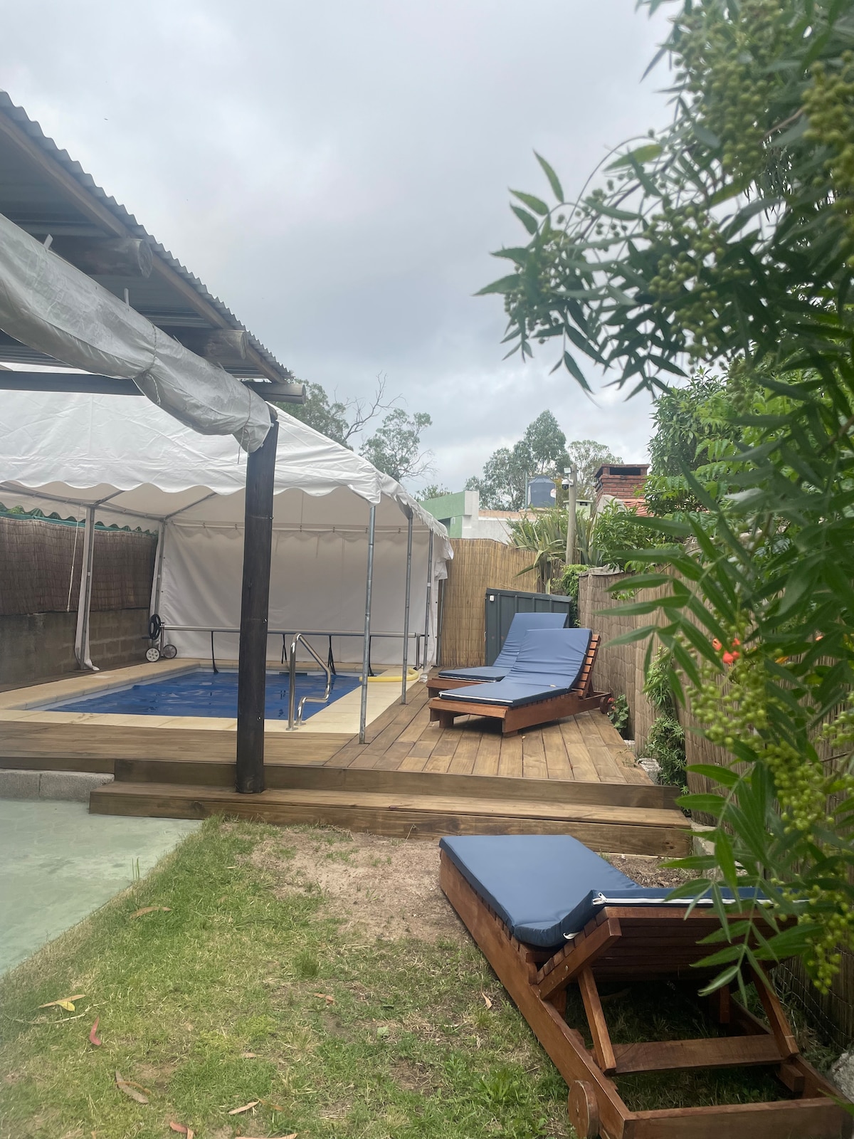 Casa de playa balneario San Luis. Piscina climatizada de uso exclusivo (consumo eléctrico inlcuido en el precio). Cómoda y equipada para 5 personas. Wifi, Parrillero techado, entrada para varios vehículos, con fondo muy lindo, todo cercado. Cuenta con Direct tv prepago a cargo del huésped si quiere recargarlo. A una cuadra del supermercado principal, Redpagos y otros servicios. A 6 cuadras de la playa. Balneario tranquilo y familiar. Estamos disponibles para contestar cualquier consulta.
