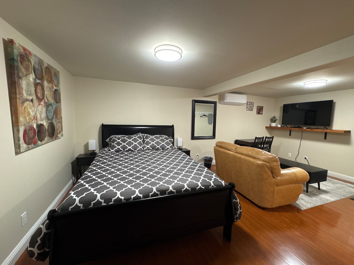 Estudio de invitados limpio y de nueva construcción con entrada privada situado en el centro de un barrio residencial cerca del centro de Redwood City. Cama tamaño queen con baño completo, aire acondicionado y nevera/cafetera/microondas. Pequeño escritorio junto a la cama ideal para trabajar a distancia o estudiar. Registro de entrada fácil y autónomo con cerradura inteligente y aparcamiento fácil.