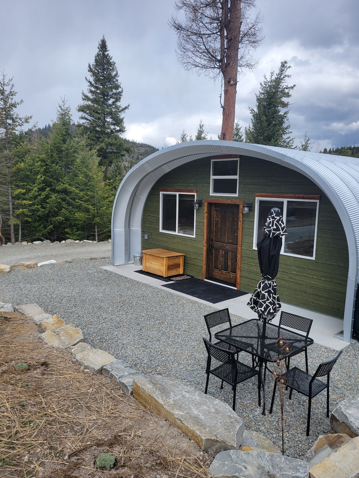Cabaña Quonset en el bosque, con vistas a las montañas