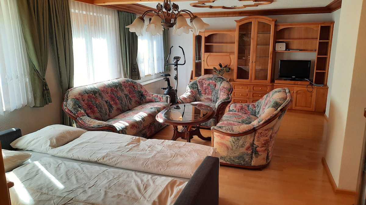 Nuestro apartamento tiene capacidad para cuatro personas y tiene un dormitorio y una cocina-sala de estar. También hay disponible un sofá cama, un televisor inteligente y wifi. También hay un baño separado con ducha e inodoro. La terraza y un pequeño jardín te invitan a relajarte y quedarte. También hay un compartimento climatizado en el sótano. Hay una cochera disponible para el estacionamiento seguro de tu auto.
