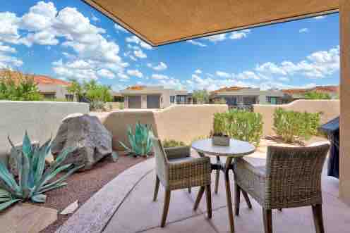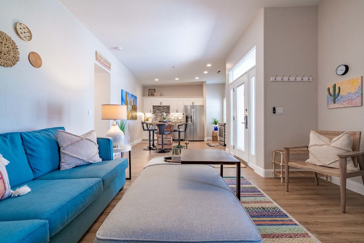 Este lugar único tiene un estilo propio. Ven a relajarte en nuestro espacioso refugio bohemio con una cocina completa, hermosa sala de estar con chimenea y cama tamaño king muy espaciosa con bañera de hidromasaje en suite con bañera de hidromasaje grande, ducha a ras de suelo y tocador doble. Es un lujo en el desierto en todo su esplendor. El patio privado es un lugar ideal para comenzar y terminar el día con mecedoras, salón de bronceado y mesa de comedor. Frente al condominio se encuentra la piscina para adultos para relajarse, refrescarse y tomar el sol.