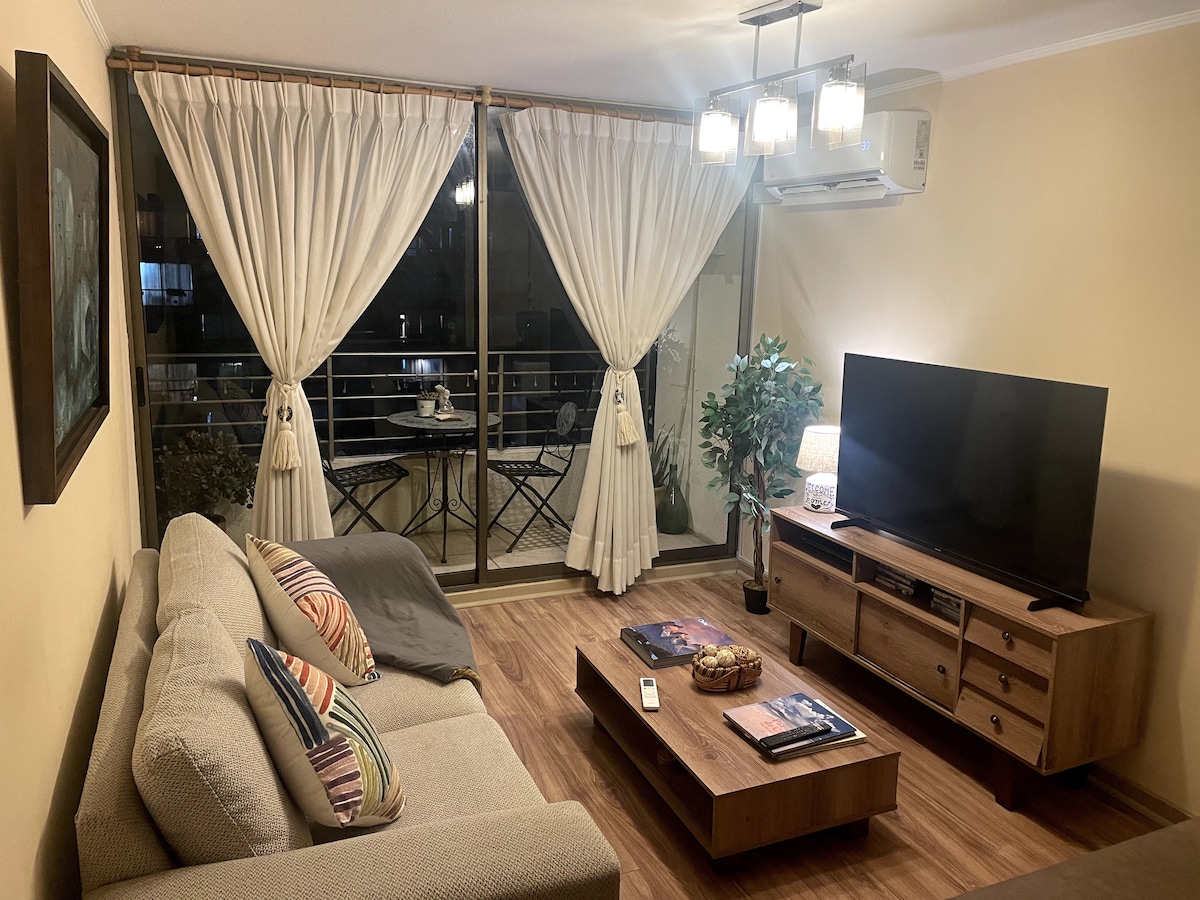 Encantador departamento en el corazón de Santiago con una impresionante vista panorámica del centro de la ciudad. Disfruta de los rascacielos iluminados por la noche y de paisajes urbanos durante el día. Este acogedor espacio cuenta con comodidades modernas, una decoración elegante y todas las comodidades necesarias para una estancia inolvidable. Desde el balcón privado, podrás deleitarte con vistas panorámicas que abarcan desde la cordillera hasta los puntos emblemáticos de la ciudad.