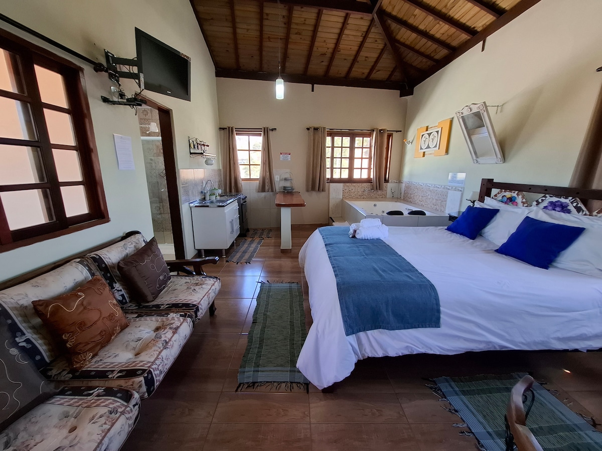 Suíte para casal com hidro, lareira e cozinha