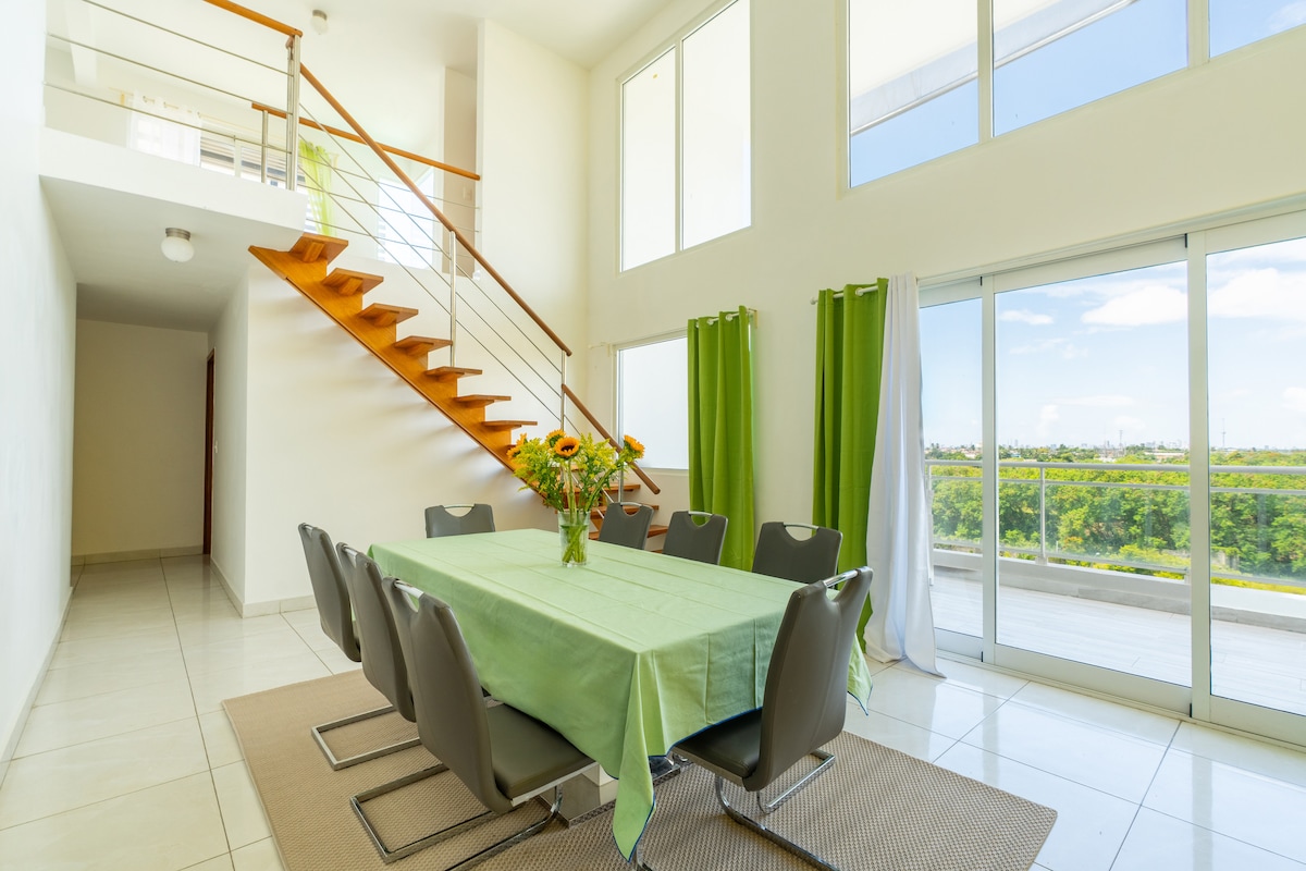 A estrenar espectacular ático de 3 dormitorios y dos pisos. ubicado a 10 minutos de la Embajada de los Estados Unidos en Santo Domingo. ¡Nuevo centro comercial a 3 minutos! Nuestro ático está ubicado en la única torre de la zona de Santo Domingo Norte (Avenida Jacobo Majluta). Seguridad privada, 2 plazas de estacionamiento, zona de piscina, zona de barbacoa, acceso al gimnasio. También hay un parque infantil. Es perfecta para viajes de negocios o familiares. Estamos dispuestos a proporcionar consultas adicionales (chófer privado, alquilar autos, chefs o servicio de limpieza).