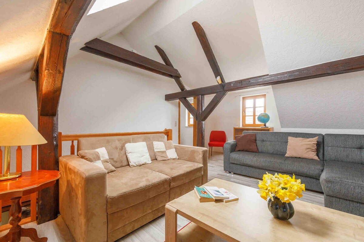 Relájate con toda la familia en este tranquilo alojamiento. En este apartamento, los pequeños son muy grandes :) ¡Atención! Especialmente adecuado para huéspedes de hasta 1,80 m. Debido a las vigas de madera bajas, el apartamento no es tan adecuado para huéspedes de más de 1,85 m debido al riesgo de golpes. No estamos en Auenland, pero en Huy es al menos igual de bonito. :)