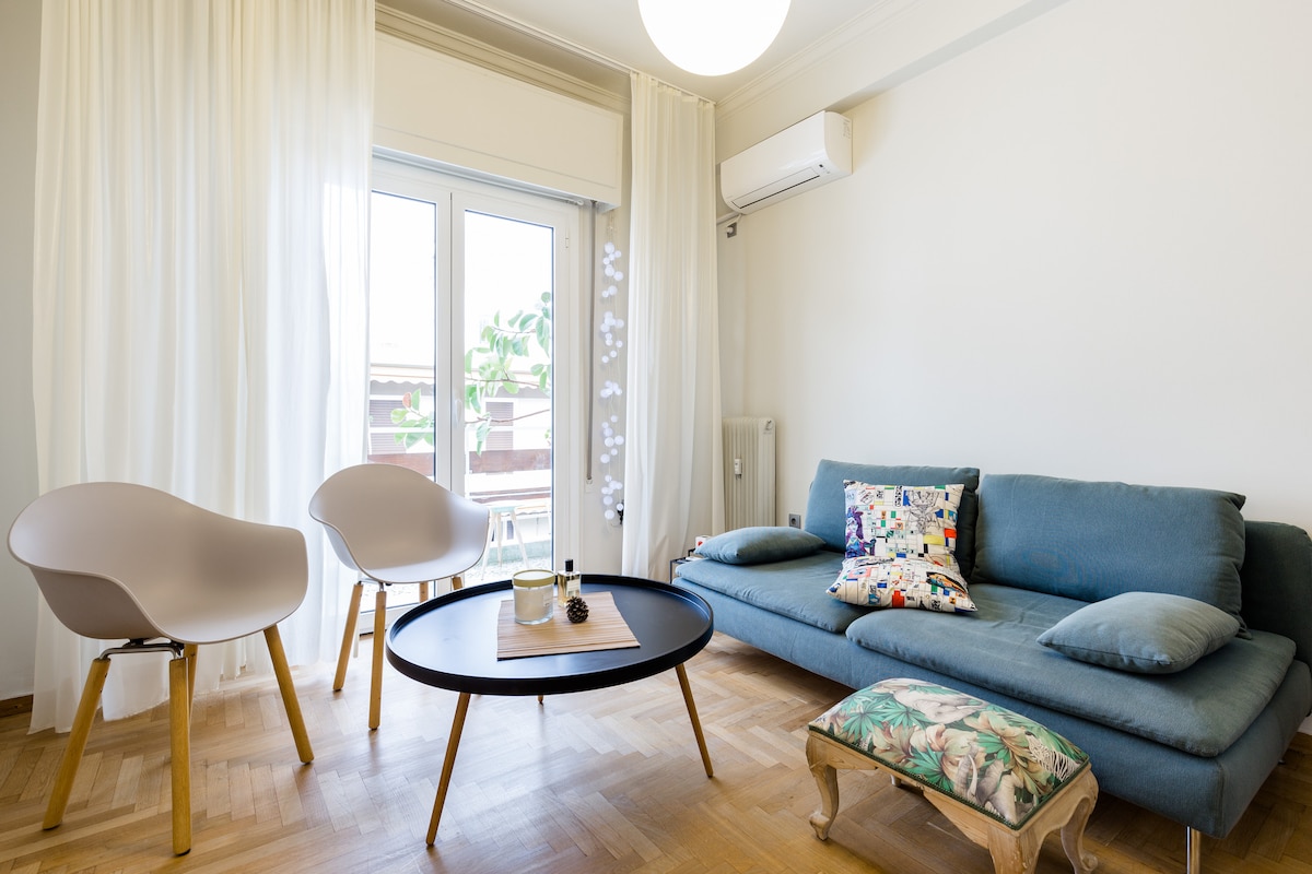Lujoso apartamento en la mejor zona y lugar en Aegina - Maratón, junto al mar. El apartamento está completamente renovado, con cocina, sala de estar, 2 dormitorios, uno con cama doble, el segundo con 2 camas individuales y en el sofá cama de la sala de estar para 2 personas más,total 6 personas. Amplio balcón con vistas al mar. Baño con ducha , aire acondicionado, TV, wifi, Netflix, Automatización en la puerta para acceder con código. Acceso a pie a restaurantes de playa y playas organizadas.