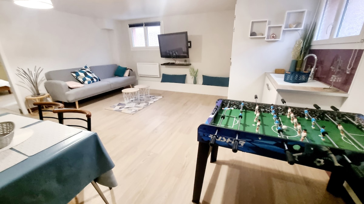 Disfruta de un alojamiento elegante y céntrico. Muy cerca de todos los servicios, dos panaderías, a dos pasos del mercado cubierto (martes, jueves, sábado), en el corazón de la ciudad, le damos la bienvenida a nuestro apartamento completamente renovado. El apartamento se encuentra a menos de 10 minutos a pie de la estación de tren SNCF. Para los viajeros que viajan en pareja y desean un juego de cama para el sofá cama, este se cobrará 15 € a petición.