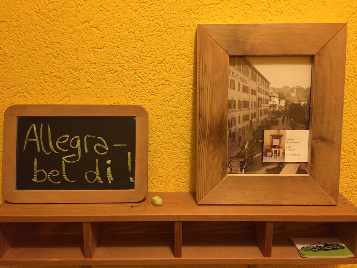 El pequeño departamento (dormitorio, sala de estar, comedor (sin estufa), ducha/inodoro) en una granja de 400 años de antigüedad está cerca de la estación de tren Ardez. Hay muchos utensilios antiguos en la casa y en el departamento. Te va a encantar mi espacio por el estilo de antaño, equipado con todas las comodidades. Nuestros huéspedes cercanos disponen de un estacionamiento gratuito.