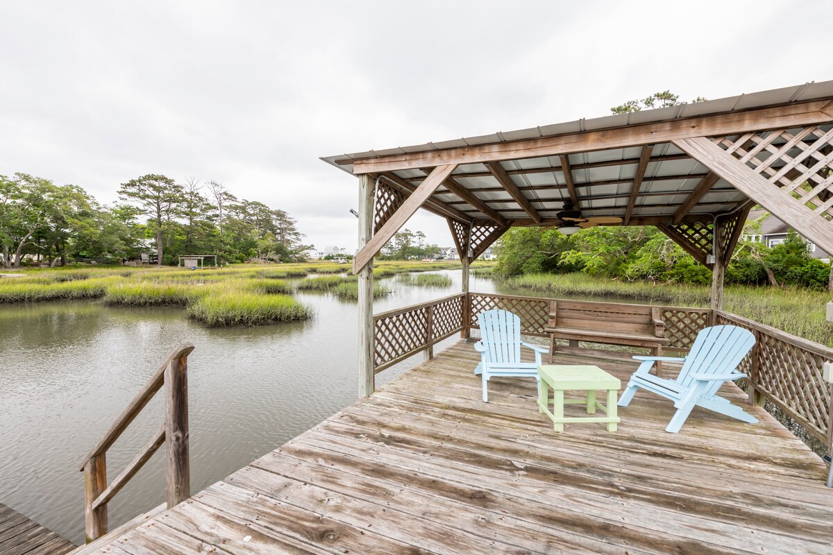 *Breathtaking Sunrises & Sunsets water view *Sunroom 3 season porch. *Overlooking Jarrett Bay. * 2 bed, 2 bath. Sleeps up to six guests. * Launch your own boat or kayaks or rent across the street * Located 15-45 min to Beaufort, Atlantic Beach, Shackleford Banks, Cape Lookout, NC Aquarium * Game room, ping pong, foosball, yard games * Beach chairs, umbrella * Great location for Beach-goers, Duck Hunters , Cape lookout fishing *Fire Pit