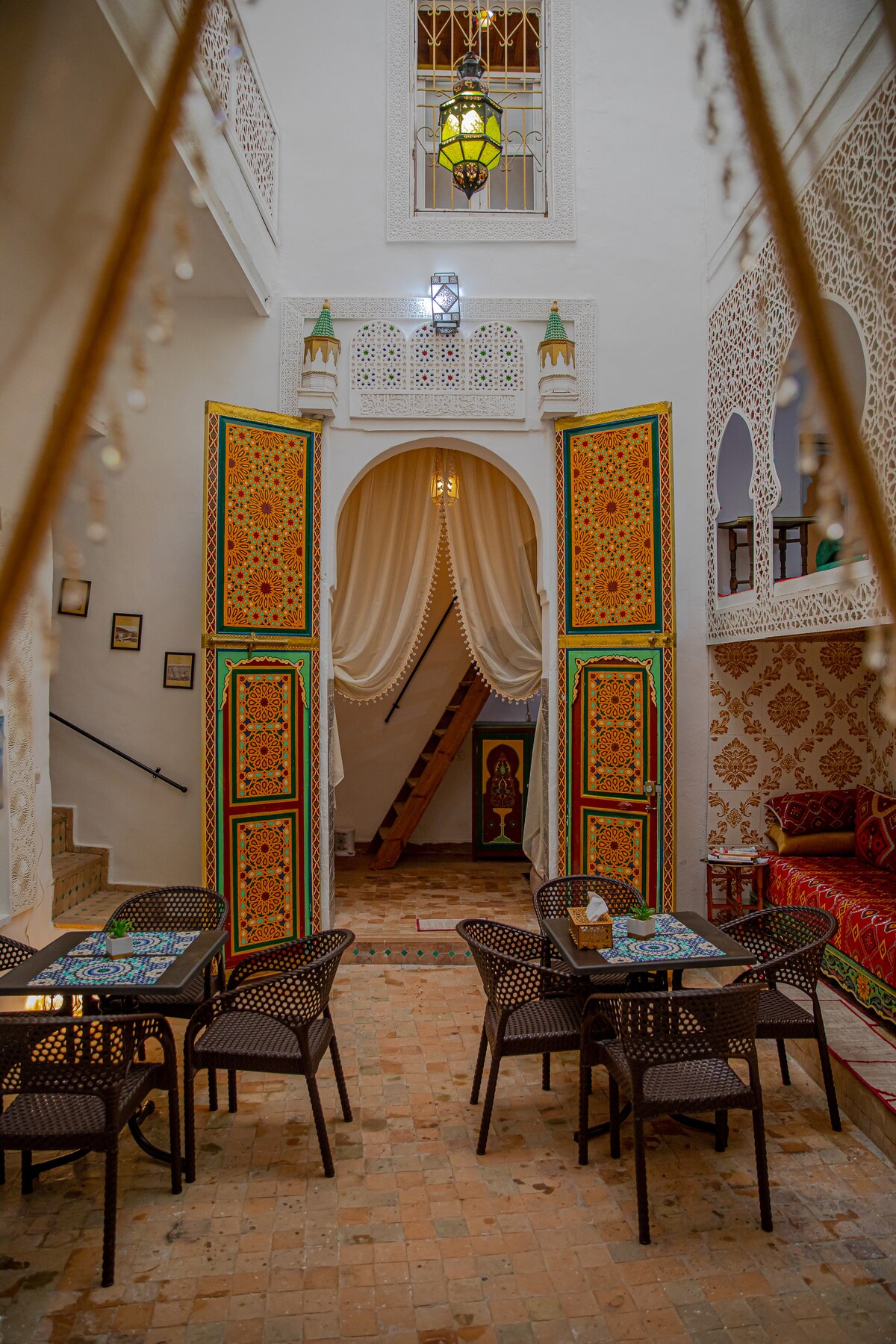 Mezcla con maestría el estilo marroquí atemporal con un diseño moderno Situado en el corazón de la antigua Medina Fez. Ofrece una experiencia inigualable. La amplia suite cuenta con un gran dormitorio, sala de estar adornada con baño privado de mosaico marroquí y aire acondicionado. Los muebles recogidos a mano y las telas exquisitas crean un ambiente de elegancia. Comienza el día con un delicioso desayuno en tu terraza privada y disfruta de la máxima paz y privacidad. ¡Experimenta la magia de Marruecos como nunca antes!