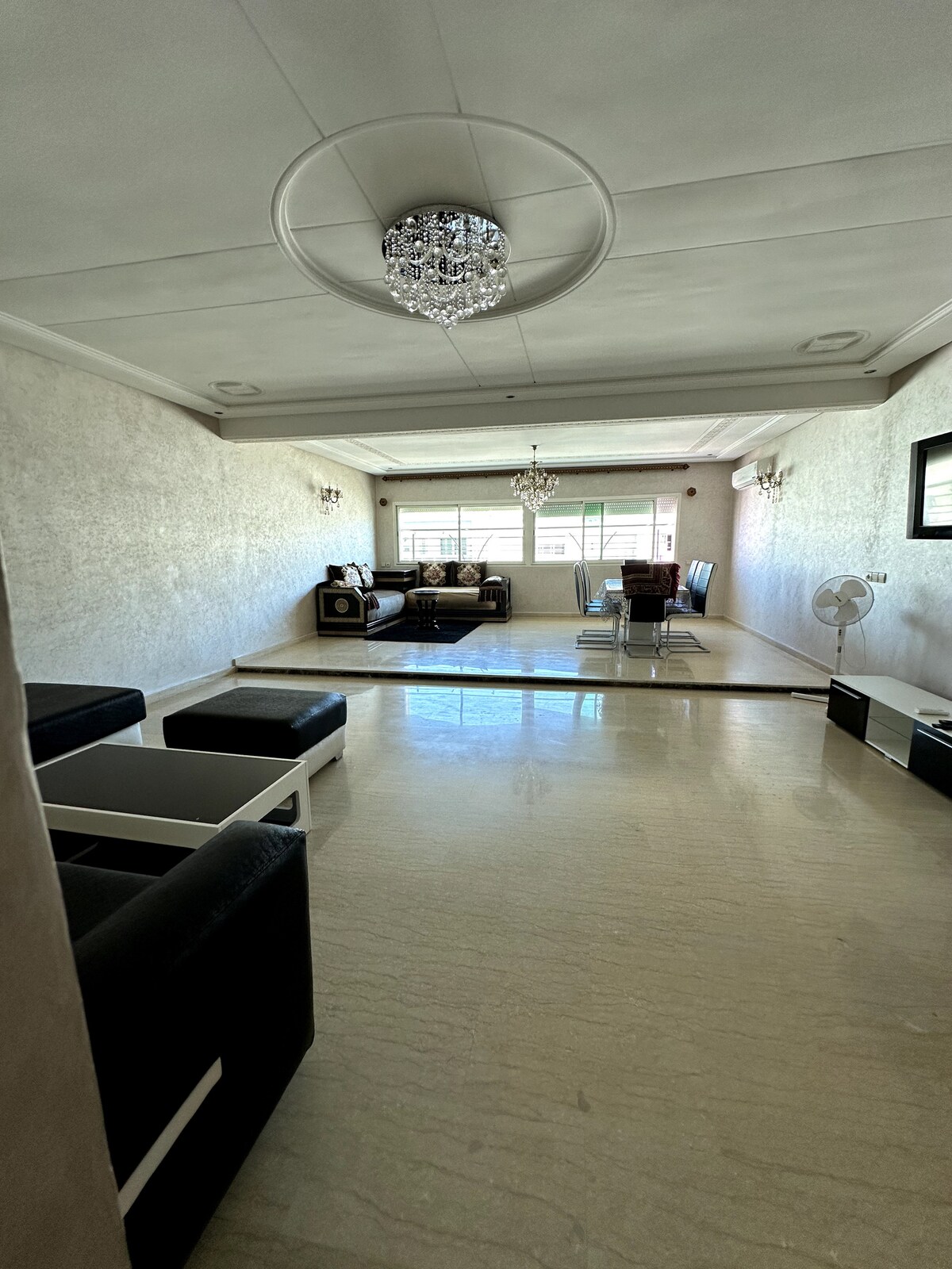 Relájese en este espacio tranquilo y elegante hermosa casa en el corazón de la ciudad el hajeb que consta de un (2)dormitorio con balcón una sala de estar una cocina abierta y bien equipada con un baño caliente,un gimnasio, una conexión Wi-Fi,un (3) smart tv,, osn+,shahid gratis y una calefacción de gas.d.,una cama para bebés d,un biraux para su trabajo d,una terraza para comer al aire libre