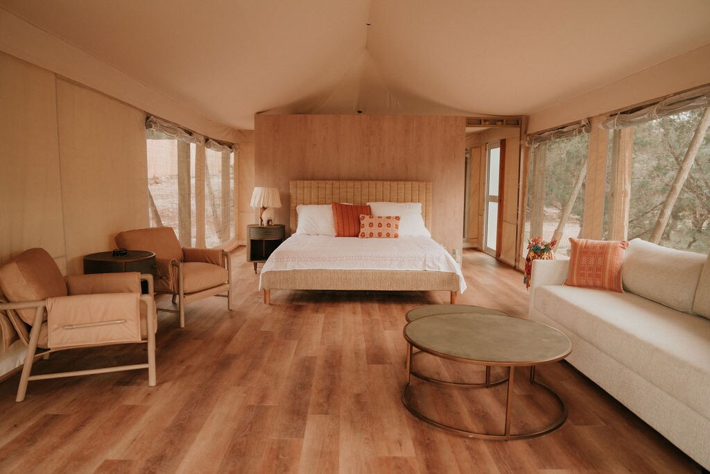 Experience the perfect blend of comfort and nature at our tranquil glampsite. Nestled in a peaceful setting, our cozy retreat offers a restful escape from the everyday hustle. Unwind, relax, and reconnect with nature in a space designed for serenity and relaxation. Ideal for romantic getaways or quiet family retreats. AMENITIES + temperature controlled + king-size bed + queen-size sleeper sofa + kitchenette + luxury comfort bathroom + outdoor shower + private deck