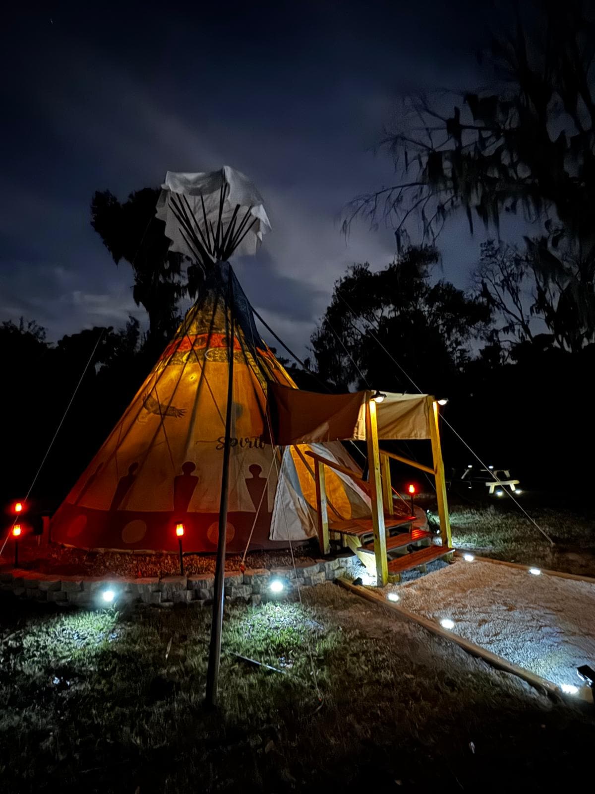 Spirit Warrior Tipi Hermoso tipi de 20pies, en el bosque de Music Springs: el lugar más tranquilo del este de Texas, donde el toque de Dios corre por el bosque. Un lugar de refugio y un lugar para recordar para muchos que visitan. Los árboles están iluminados con más de 1000 pies de luces de fiesta para que puedas disfrutar de los pinos después del anochecer. Estamos ubicados a 5 millas al norte de Hawkins, Tx