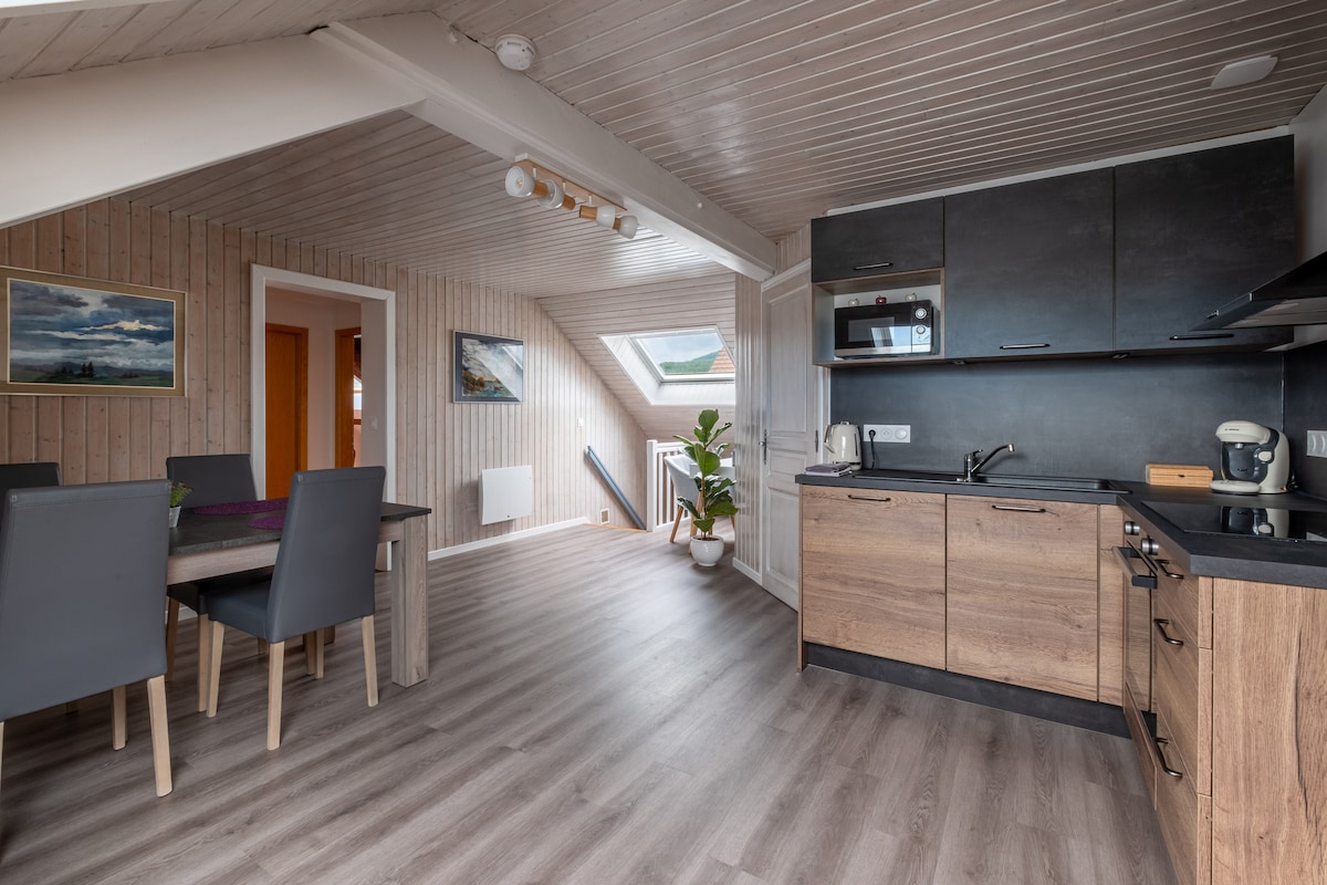 Casa de madera con gran terraza en el corazón de un pequeño pueblo encantador, con todas las comodidades. Ideal para dos personas, hay espacio para un tercer viajero. Ubicado en las alturas del pueblo, puedes ver los Alpes desde la terraza cuando el clima lo permite. Los entusiastas del senderismo pueden explorar los bosques de los Vosgos desde la casa, incluido el sitio de la Planche des Belles Filles, famosa por el ciclista Tour de Francia.
