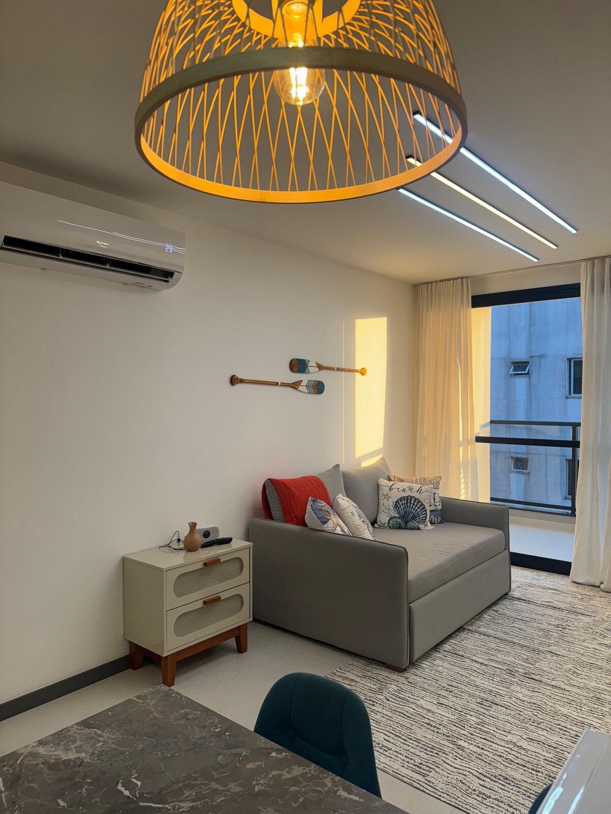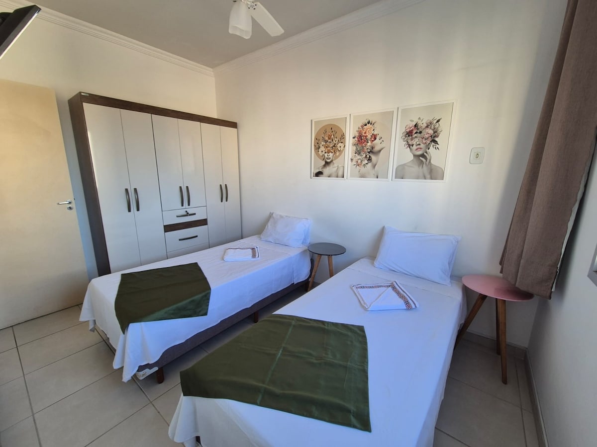 Relájate en este espacio tranquilo y elegante. Nuevo apartamento, todo con aire acondicionado, recibiendo a nuestros primeros huéspedes, dormitorio con cama tamaño queen, aire acondicionado, balcón, sala de estar con sofá cama y cocina, el edificio tiene un minimercado en la planta baja, un espacio de estacionamiento, ascensor social y de servicio, conserje digital. Jardim Camburi tiene varias opciones de ocio, bares, restaurantes, gimnasios, lavanderías, spa, plazas, panaderías y a solo 3 km de la playa Jardim Camburi.