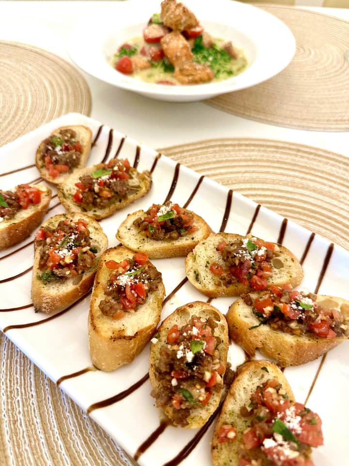 Comienza con la bruschetta de salsiccia ahumada, seguida de mi lasaña siciliana a la boloñesa, con capas de ragú y bechamel cremosa. Termina con una tarta Tatin de manzana caliente servida con crema batida.