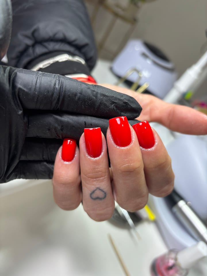 Manicura completa en las manos con base de gel y esmalte de gel.