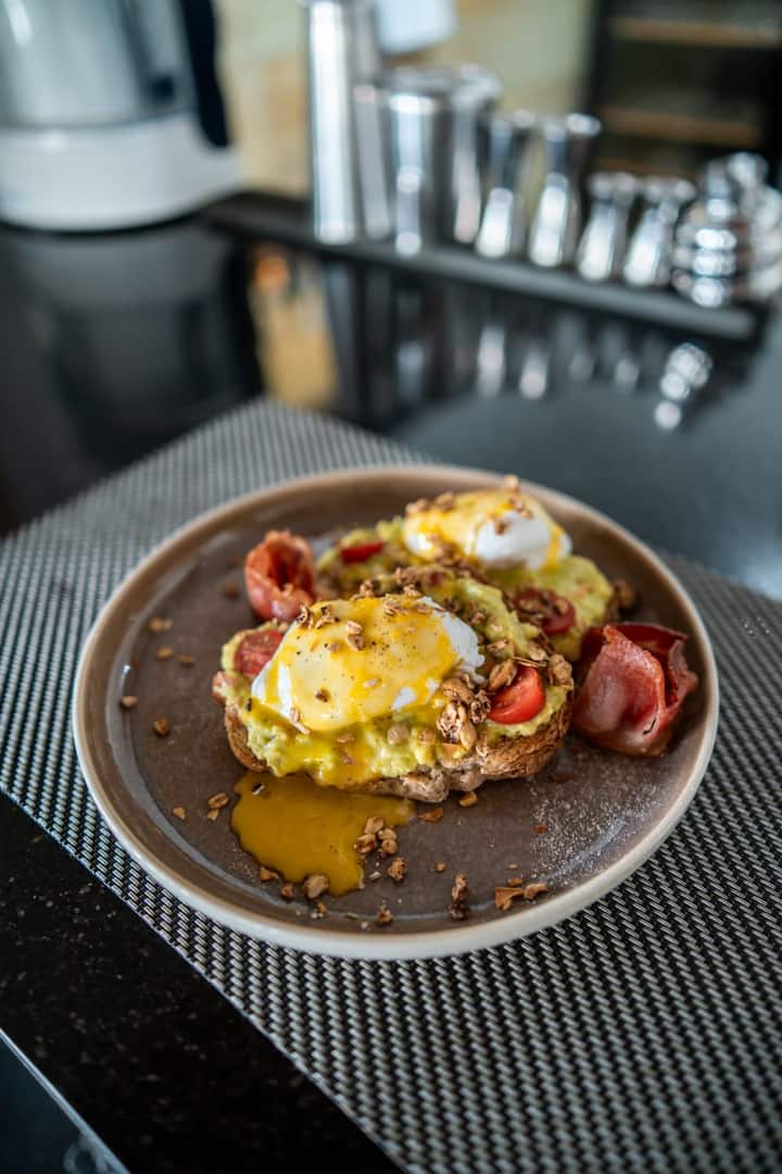 Este desayuno incluye tostadas de aguacate en pan fresco, cubiertas con tocino o salmón ahumado y huevos, servidas con una bandeja de frutas de temporada y jugo de naranja recién exprimido.
