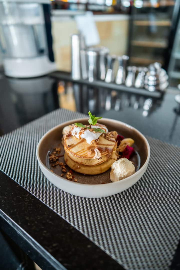 Esto incluye panqueques esponjosos de tres capas cubiertos con granola, salsa de caramelo, mascarpone y azúcar glas, servidos con una fuente de fruta fresca, mermelada y agua de coco o jugo de naranja.