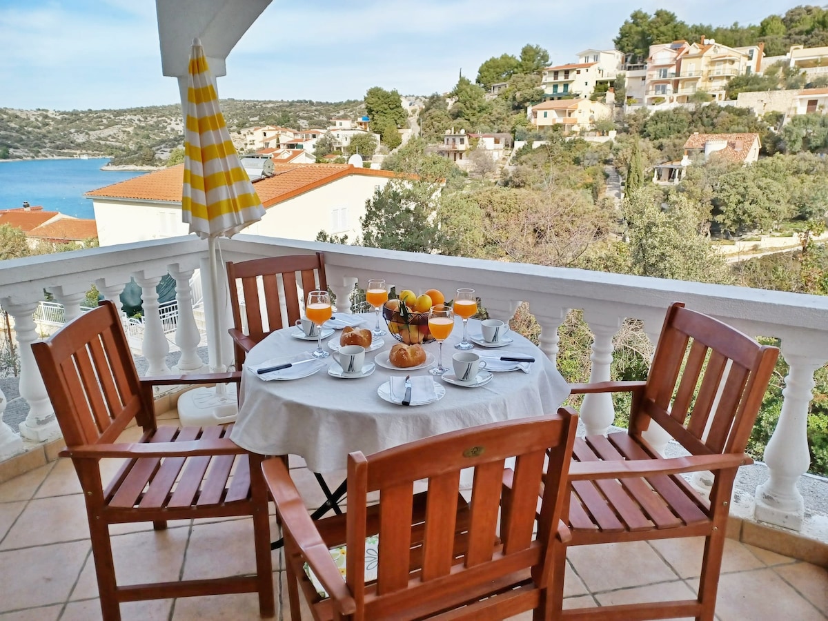 ¡Conexión WIFI 7 RÁPIDA! La pequeña habitación está situada en la planta superior y ofrece bonitas vistas a la bahía de Trogir. Incluso puedes ver Split a lo lejos, con la montaña Mosor detrás. La habitación es perfecta para 2 personas. Otras características de la habitación son: cocina americana, aire acondicionado, 1 baño pequeño y un televisor inteligente de 43 pulgadas con Netflix, etc. Puedes ver directamente al mar mientras te acuestas en la cama (180 cm x 200 cm). El balcón es de tamaño decente. Hay una mesa con 2 sillas y 1 tumbona para broncearse.