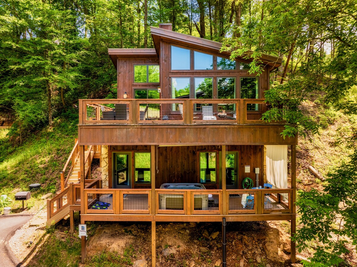 ¡Descubre por qué esta cabaña está en el Top 5% en Airbnb! ¡Hermoso, a 1 milla de Parkway y la isla! 2 espaciosas suites King Master para una noche de descanso. ¡2 baños privados completos, sofá cama, sauna, jacuzzi, sala de juegos y chimenea! MUCHAS comodidades. Te encantará este nivel abierto de 1 nivel y 3 juegos de puertas francesas al balcón privado. Relájate en el porche delantero con vistas al valle o disfruta del jacuzzi en el gran espacio del patio trasero. La sala de estar tiene techos altos y una acogedora chimenea para un retiro.