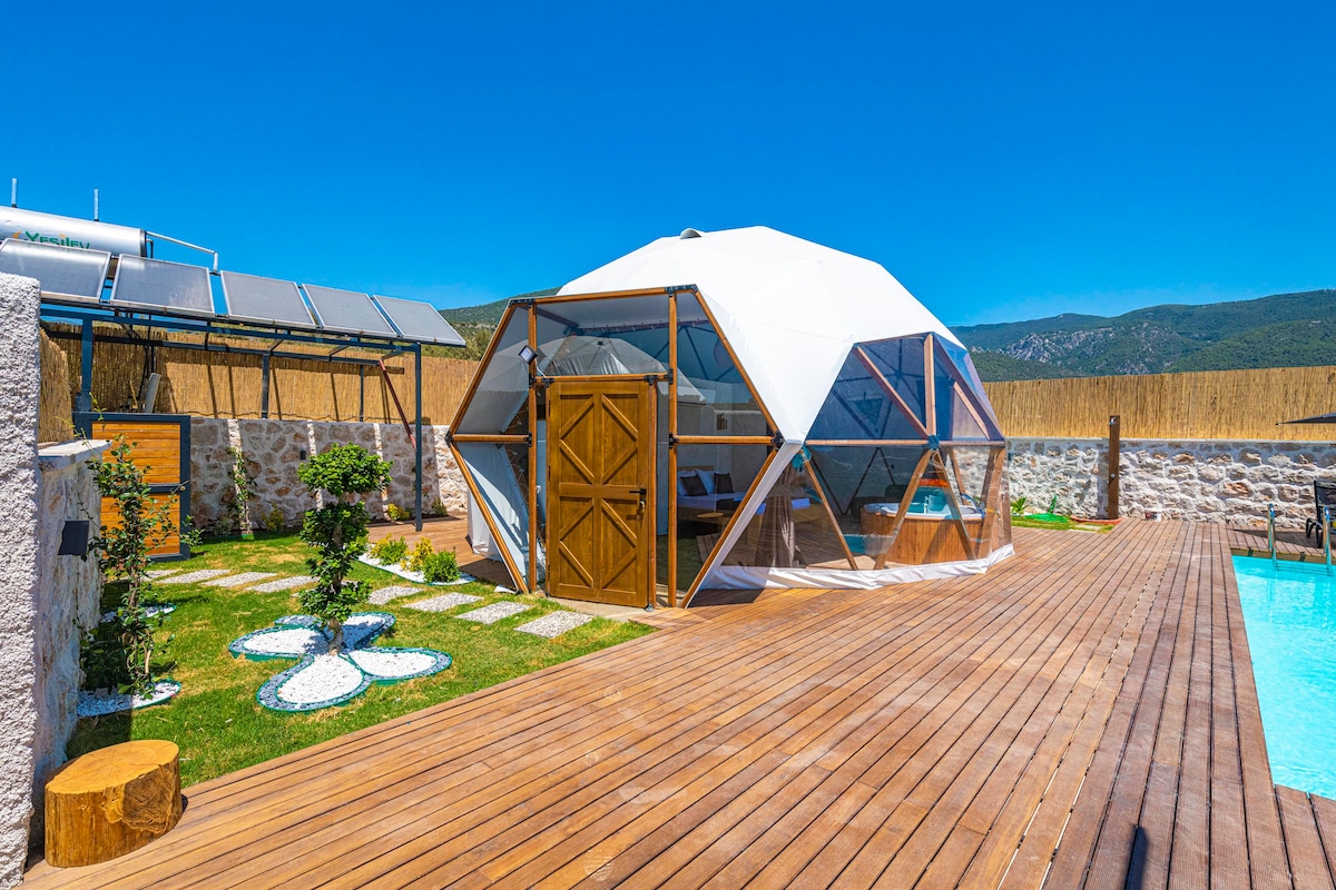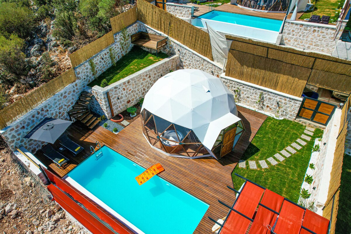 Türkiye'de yeni yeni popülerleşmeye başlayan dome glamping tasarımlı evlerimiz, muhteşem konsepti ile dikkat çekmektedir. Kalkan Çayköy bölgesinde konumlandırılmış olan dome balayı suitimiz, sizler için özel olarak tasarlanmıştır. Modern ve oldukça farklı bir dizayna sahip olan balayı suitimiz korunaklı yapısı ile de dikkat çekmektedir. Alışılmışın dışında bir tatil deneyimi yaşamak istiyorsanız, Kalkan Dome Suites 8 kapılarını siz değerli misafirlerimiz için aralamaktadır.