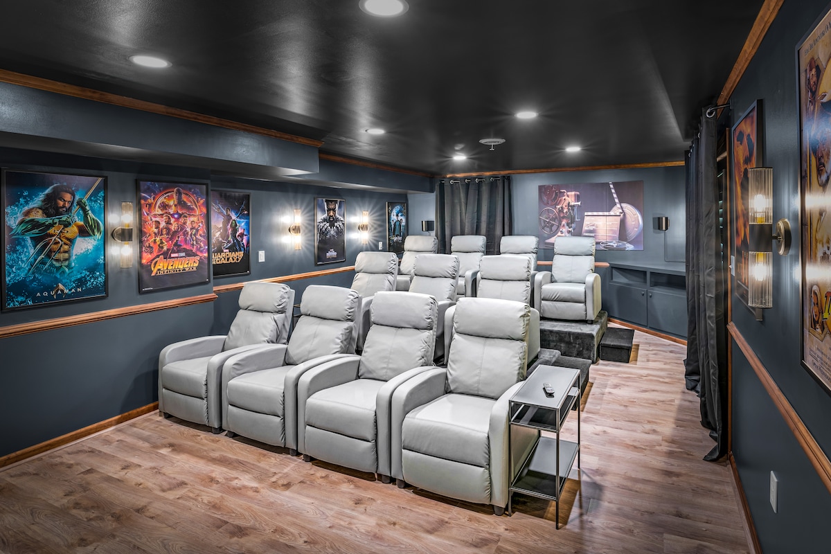 ¡Tu CINE-PLEX privado! Gimnasio, CINCO televisores Amazon Fire, 3 camas tamaño king, suite principal, pantalla de 110 pulgadas, asientos de 3 niveles, iluminación inteligente en todas las habitaciones, audio para toda la casa, XBOX Series S, ¡Alexa! Fácil APARCAMIENTO justo en la puerta principal. Busca Guelzo Experiences en YouTube Video Tour. ¡Creado para ti por un diseñador de sonido cuyo currículum incluye Fast & Furious 7, Robocop y más! Nos encantan las películas y queremos compartir algo que solo un toque profesional podría crear, ¡una experiencia de visualización multiplex!