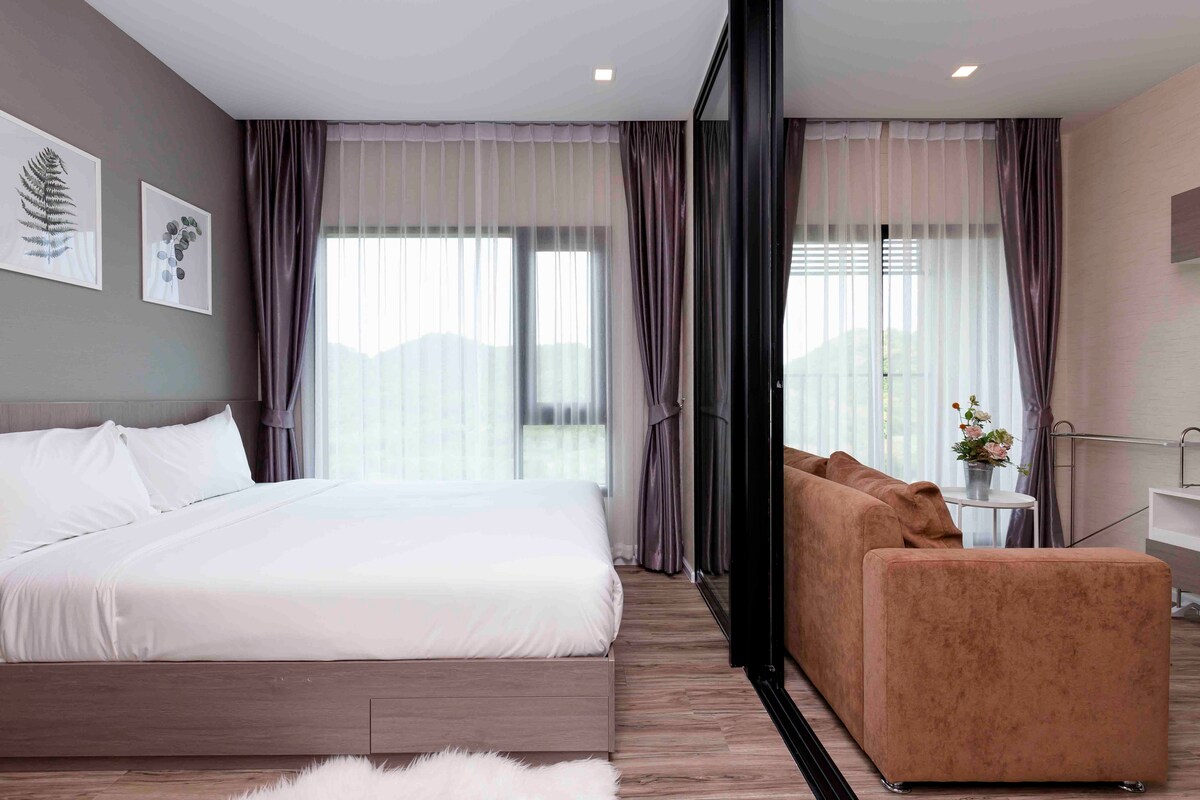 Mi habitación es una unidad nueva, totalmente amueblada en estilo hotel, situada en una ubicación conveniente, si buscas un alojamiento cómodo y conveniente en Chonburi, mi lugar es perfecto. El lugar es de 1 cama y 1 baht de 33,5 metros cuadrados con hermosas vistas a la montaña. Fibra óptica gratuita Inernet 1000 Mbps/200 Mbps A 5 minutos del centro de la ciudad de Sri Racha. Si se requiere Tm30, avísame antes de hacer el check-in.