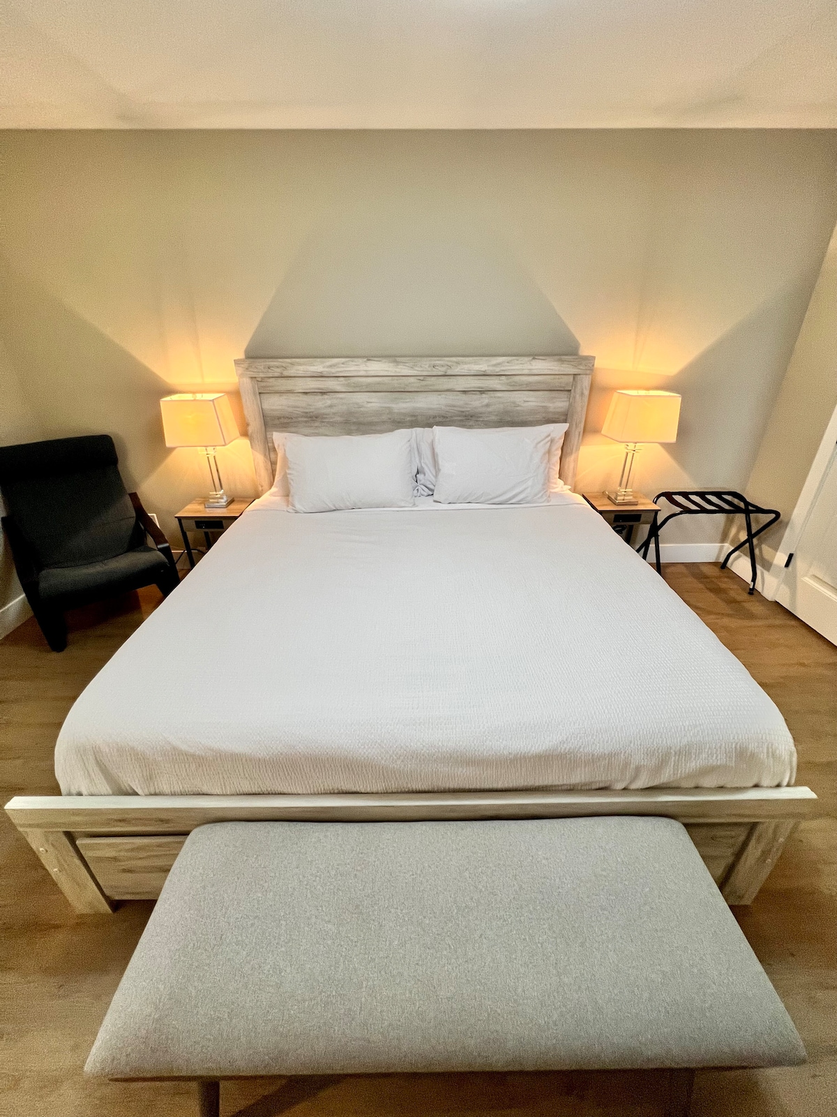 Esta acogedora suite pequeña se encuentra en una calle tranquila a pocos minutos del centro de la ciudad, senderos, playas y todas las demás comodidades. La cocina pequeña está bien equipada con varios suministros y elementos básicos. Al otro lado de la habitación hay una cómoda cama tamaño queen con sábanas limpias y muchas almohadas. También se incluyen dentro de la suite un baño de 3 piezas bien surtido, un juego de comedor, un televisor inteligente, un armario con banco y una bata. ¡La bañera de hidromasaje es maravillosa para relajarse después de un día lleno de aventuras!