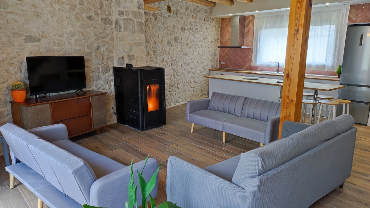 La casa cuenta con una habitacion con cama de matrimonio y supletoria, una habitacion con dos camas y supletoria y una habitacion doble, dos cuartos de baño completos, cocina, salon, chimenea, patio, calefaccion, aire acondicionado. Admitimos mascotas. La casa se entrega equipada de ropa de cama,toallas, menaje de cocina, cafetera italiana,etc. Estamos en el centro del pueblo, con farmacia, supermercado, gasolinera, restaurantes. Disponemos de Smart Tv de 40'' Hay cuna para bebes