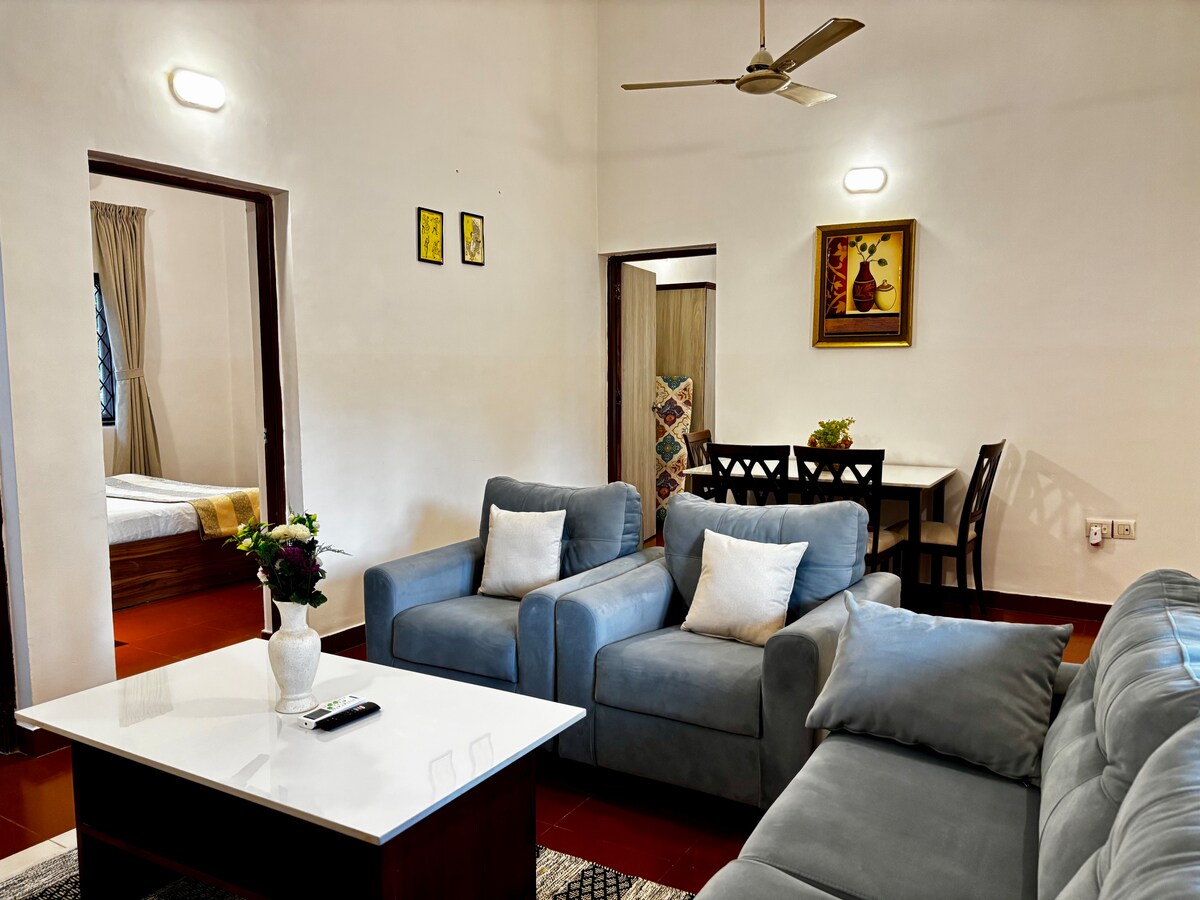 Un refugio tranquilo en Goa: tu refugio de trabajo y descanso en Candolim. Bienvenido a tu serena escapada en Candolim, norte de Goa para disfrutar de tu estancia en este alojamiento entero de 1 bhk (planta baja) que te espera con conexión wifi. El sonido de las palmeras que se balancean reemplaza el ruido de la ciudad, y la comodidad se encuentra con la calma. Nota de temporada: (monzón/días lluviosos) Durante la temporada de lluvias, hay un corto paseo de 15-20 pasos junto a la piscina en tu camino a esta hermosa casa. En raras ocasiones, puede ocurrir un ligero anegamiento.