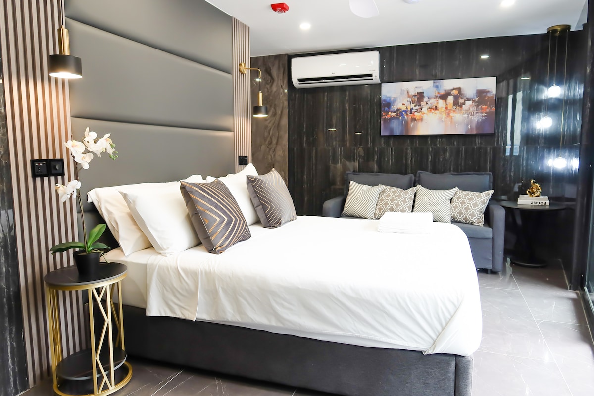 Bright, open-plan studio with a comfortable king bed and a functional kitchenette — a perfect fit for those wanting simplicity and value. If needed, the sofa can convert to a bed (extra charges apply), making it flexible for guests travelling as a pair or trio. Reliable Wi-Fi, smart TV and communal laundry facilities keep things convenient and fuss-free. The room is able to accommodate 2 adults and 1 young kid below 10 years old. Extra charge of SGD 20 is applied for 1 extra adult in this room.