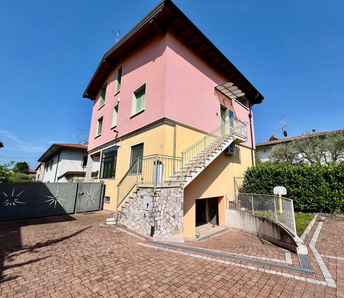 Casa en el centro histórico de Desenzano, ideal para parejas, a 500 metros del lago y las plazas principales, entrada privada en la planta baja, jardín con zona de relajación y zona con mesa y sillas, ambiente bien cuidado con baño nuevo con ducha. Cocina equipada con lavavajillas, lavadora, horno, nevera y rincón de café. Sala de estar con mesa, sofá y TV. Amplio dormitorio con una cama doble, un escritorio y un cómodo armario. Cerca de tiendas, bares y restaurantes.