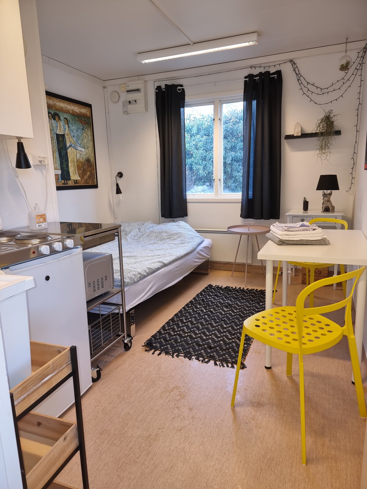 Nuevo anexo de 21 metros cuadrados de nueva construcción ubicado en un jardín privado con vistas al bosque, así como a innumerables hermosas puestas de sol. Cocina pequeña con nevera, hervidor eléctrico y microondas. Así que solo "cocinar" ligero. Wifi gratuito y TV inteligente. Pequeño baño con ducha e inodoro. Toallas incluidas. Cama doble pequeña (140 x 200 cm). Ropa de cama incluida. Estacionamiento gratuito. La distancia a Aarhus C es de 11 km. También hay transporte público disponible. No se permite fumar ni se admiten animales en la dirección.