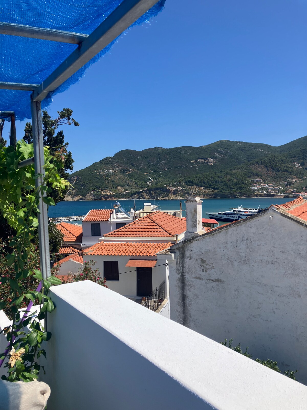 Nuestro apartamento está situado en el centro de Skopelos, en un barrio tranquilo, a solo 5 minutos a pie del puerto, restaurantes, bares, parada de autobús, taxis y el mercado turístico de la isla. Además, a 100 metros del apartamento hay un supermercado, una frutería, una panadería y una carnicería. Nuestro apartamento, que está completamente renovado, consta de un salón-cocina, un amplio dormitorio, un baño y un cómodo balcón con salón y hamaca.