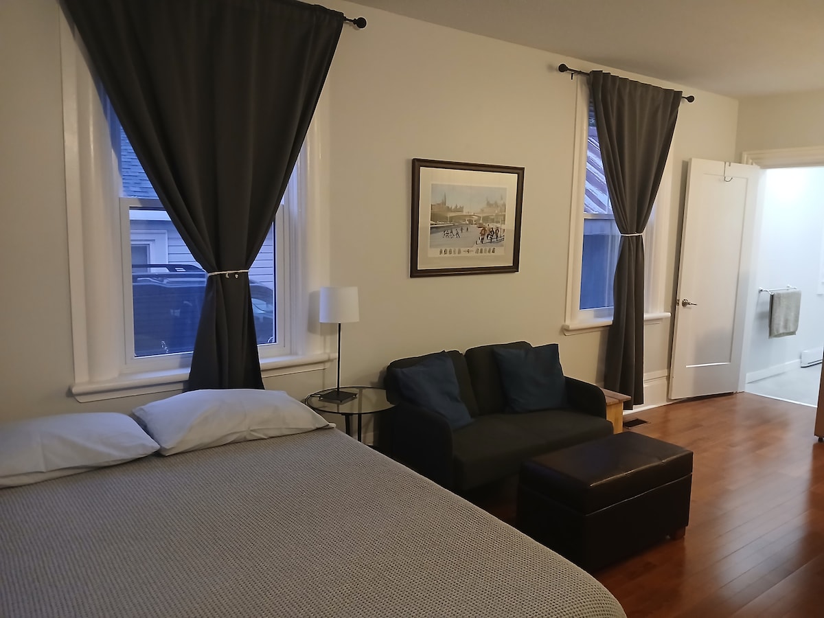 Este es un apartamento totalmente privado y autónomo con cocina completa. La casa es una propiedad patrimonial en el histórico Perth, Ontario. Se encuentra a pocos pasos del centro de la ciudad y del hermoso parque Stewart. La cocina es nueva, al igual que las 2 camas tamaño queen. El apartamento tiene aire acondicionado, wifi y televisión por cable con Netflix, etc. Tendrás todo el apartamento de arriba con entrada privada. Estacionamiento interior para un vehículo incluido. Muy acogedor y tranquilo.