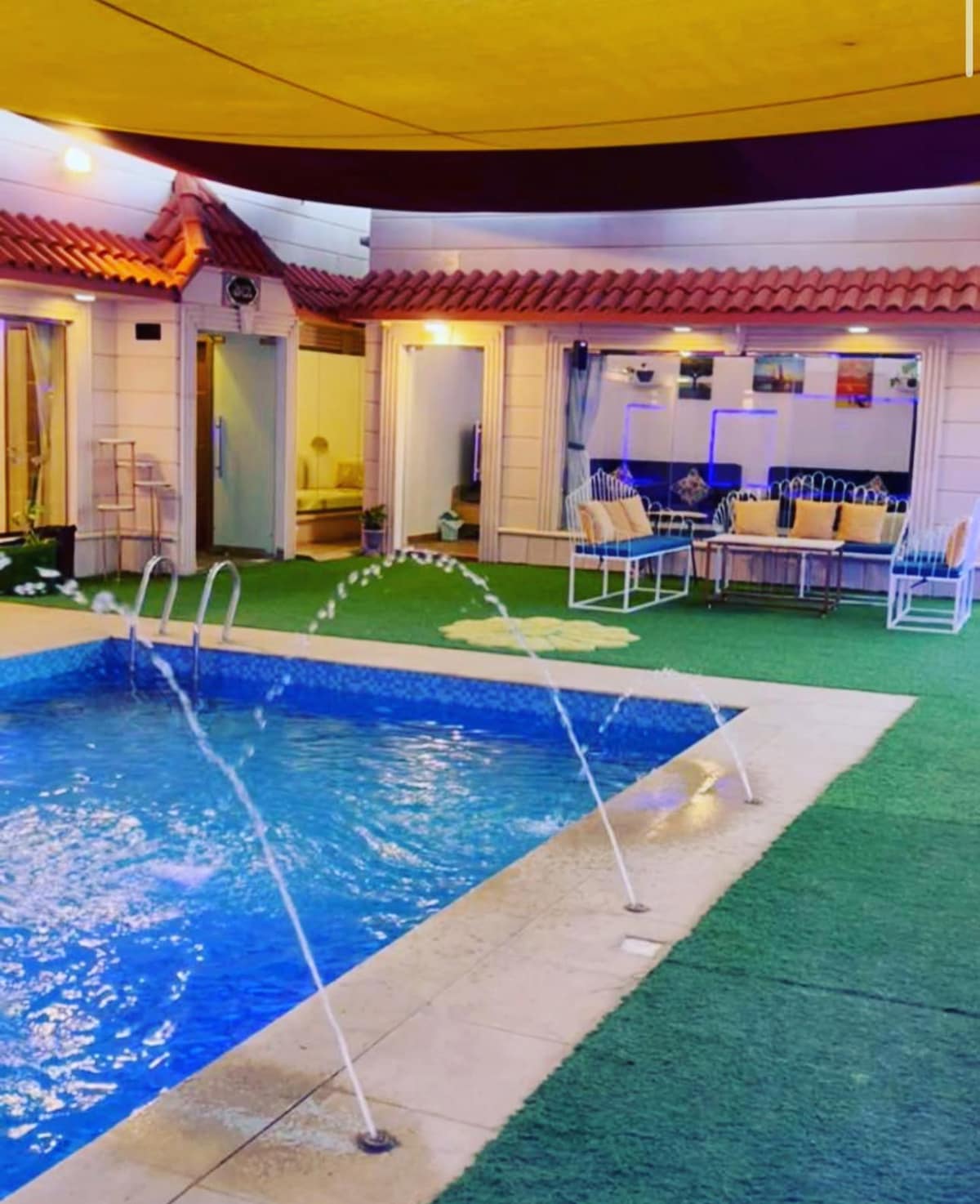استراحه فخمه في وسط المدينه بنظام عصري حديث تتألق بأثاث كندي فخم يشتمل على غرفتا معيشه كبيرتان و صالة طعام فخمه تكفي لخمسين شخص كما تحتوي على جلسه شاي خارجيه تطل على حديقة الاستراحه ذات المعشب و الأشجار الذي تحتوي ايضاً على ألعاب أطفال كما تحتوي على صالة عرض بشاشه كبيره ب١٠٠ بوصه كما تحتوي ايضاً على جلسة شواء خارجيه مع جلسات طعام و مطبخ خارجي و مطبخ داخلي و تحتى على صاله بلياردو تشرف على الحديقه.
