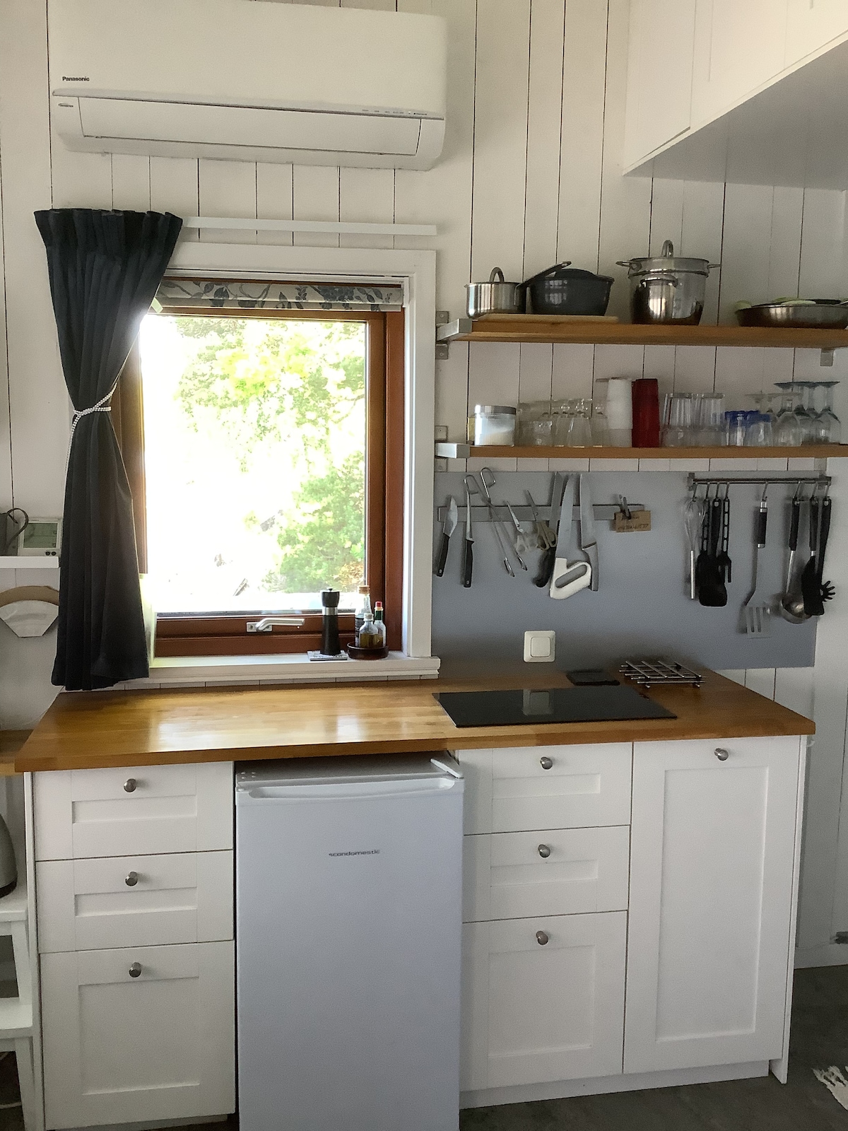 Casa de campo de nueva construcción de 30 metros cuadrados. A 5 minutos a pie del puerto. - Plano abierto con cocina y sala de estar en uno. - Loft para dormir con 2 camas individuales. - La sala de estar tiene un sofá cama. - La cocina tiene una placa de inducción y un horno. - Baño totalmente revestido de azulejos con inodoro, ducha y lavadora. - Amplia terraza alrededor de la casa con comedor. - La vista consiste en bosque de pinos y arándanos. - La limpieza NO está incluida. - NO se admiten mascotas. - Los huéspedes traen su propia ropa de cama y toallas (se pueden alquilar por 150 coronas suecas por persona)