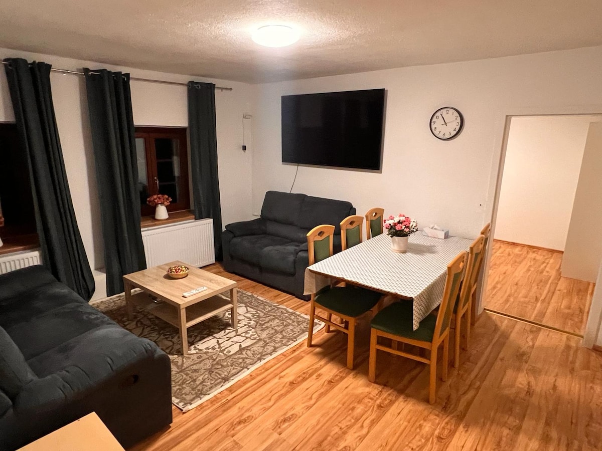 El moderno apartamento se encuentra en medio de un gran jardín con dos estanques y un pequeño arroyo. Es una casa de campo moderna reformada. El apartamento tiene una cocina moderna, un baño con jacuzzi, lavadora/secadora, una sala de estar/dormitorio y un invernadero con unas vistas maravillosas. TV, Wi-Fi gratuito y aparcamiento incluidos. El pueblo está situado en el centro y es muy tranquilo. Un lugar ideal para hacer excursiones.