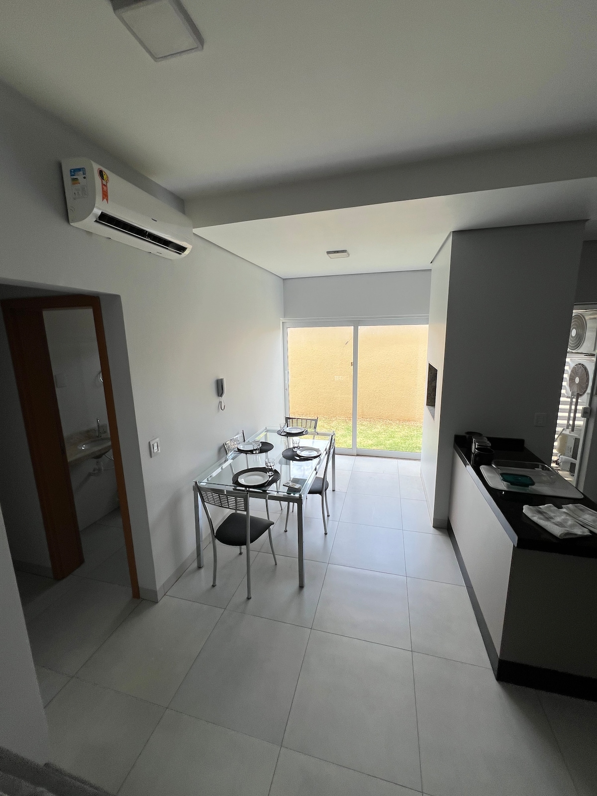 O espaço conta com sala e cozinha conjugadas, equipadas com fogão, geladeira, pia, utensílios básicos. Quarto suíte com cama de casal e ar condicionado Vaga de garagem disponível Localizada em bairro residencial tranquilo, com fácil acesso a supermercados e principais vias da cidade.