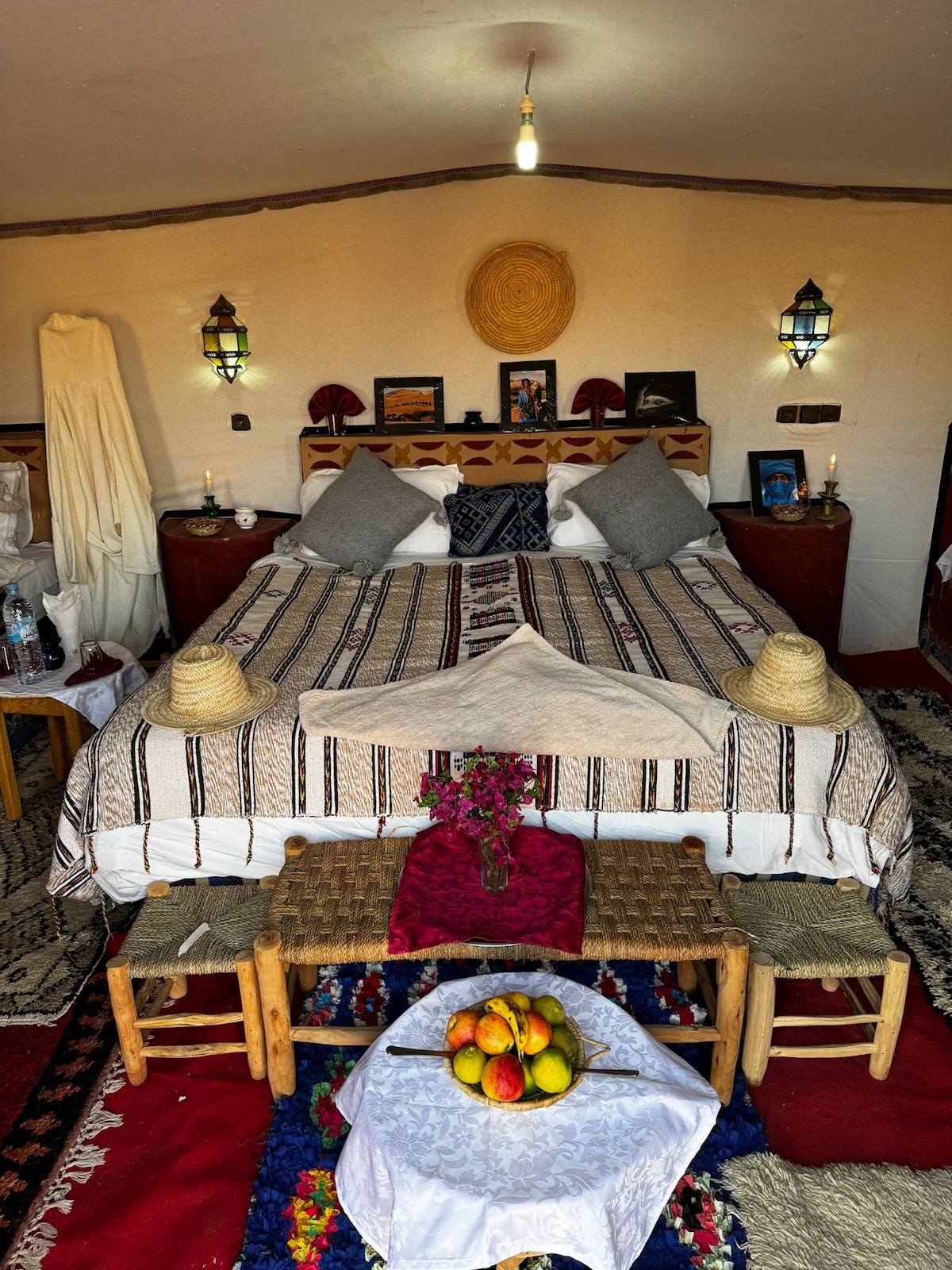 Acomódese en una tienda bereber en el corazón de las dunas y deje que la magia del desierto lo envuelva. Aquí todo invita al descanso: el silencio, la arena infinita y la intimidad de un espacio confortable con baño privado. Sienta el poder del desierto que absorbe sus pensamientos y vuelva a conectarse con lo esencial, en un cálido nido donde el lujo y el nomadismo se encuentran.