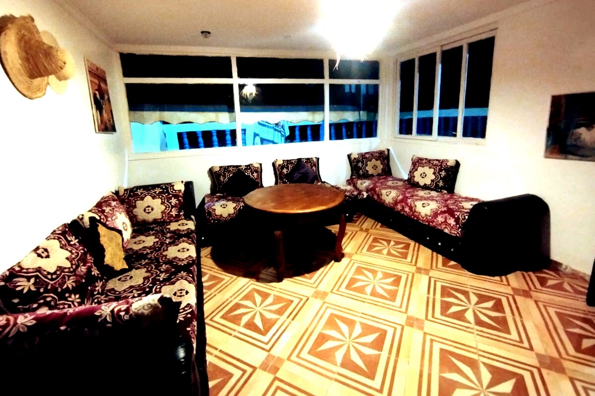 Bienvenido a tu pedacito de Marruecos auténtico, ¡donde el encanto tradicional se une al paraíso de los surfistas! 🏄♂️ Nuestra suite junto a la playa, con muy buenas valoraciones, ofrece la combinación perfecta de estilo local y comodidad moderna. 🏠 Tu espacio privado: • 2 dormitorios cómodos. • Salón tradicional marroquí con Smart TV. • Baño privado completo. • Wifi rápido (108 Mbps). Paraíso 🌅 compartido en la azotea: • Cocina totalmente equipada para uso de los huéspedes. • Impresionantes vistas al mar y a las montañas. • Asientos relajantes en la terraza. • Lugar perfecto para ver el atardecer.