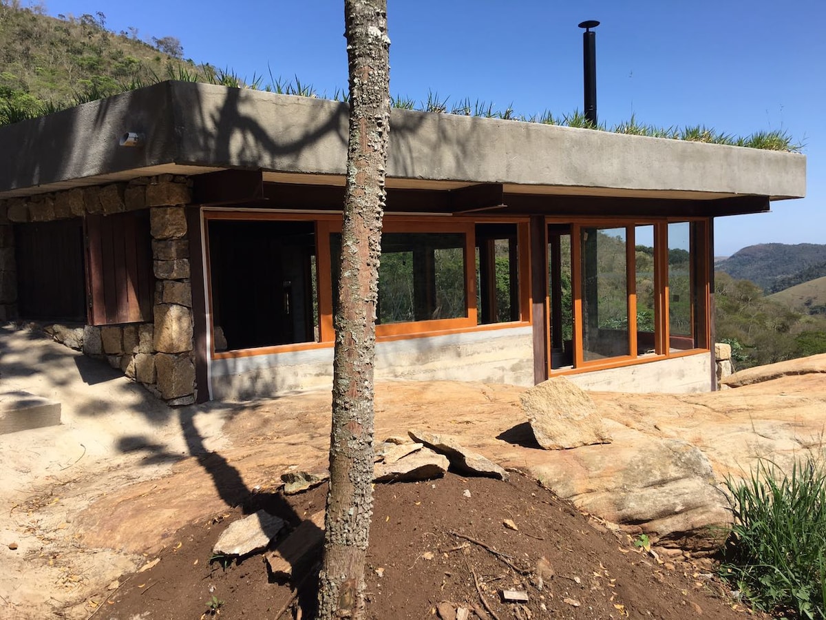 Un lugar donde realmente puedes desconectarte del mundo y volver a conectarte contigo/con los demás. En Vale das Videiras diseñado por el artista brasileño, con una arquitectura única donde el alojamiento está construido en la roca junto a la montaña. Es extremadamente tranquilo aquí. El alojamiento tiene vistas completas al valle circundante, que tiene una exuberante vegetación tropical. NO hay wifi ni recepción celular aquí. Solo puedes ponerte en contacto contigo mismo, con tus compañeros de viaje y con la naturaleza que te rodea.