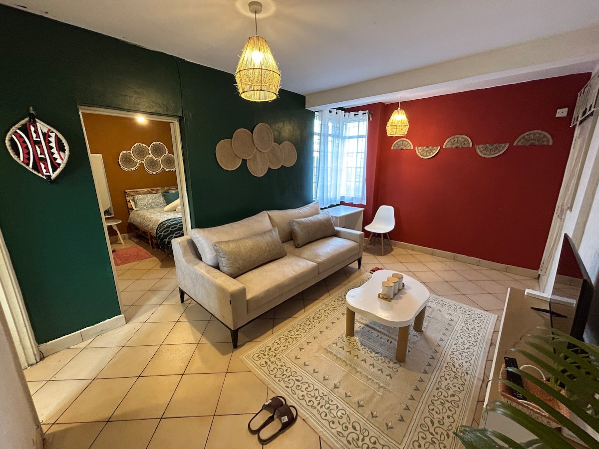 En el vibrante barrio de Kilimani de Nairobi, a poca distancia de bares, restaurantes, centros comerciales y supermercados. ¡Departamento de una habitación con obras de arte y libros africanos! Cocina bien equipada con especias gratuitas Wifi rápido para el trabajo a distancia Televisión inteligente Balcón privado Cómoda cama tamaño king Gimnasio con pesas libres Restaurante en la planta baja Aparcamiento gratuito Café y té Lavadora y secadora Limpieza dos veces por semana. Conserje y seguridad las 24 horas, 7 días a la Perfecto para amantes del arte y trabajadores remotos que buscan un espacio inspirador.