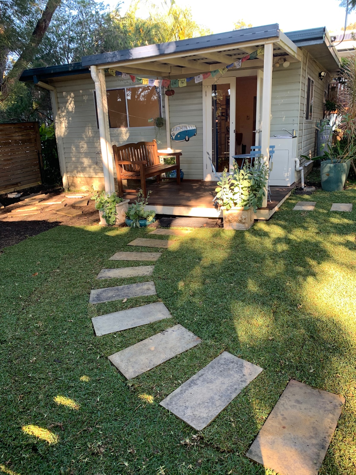 Desde el momento en que entras por la puerta, ¡sientes el ambiente relajado de Byron! Está a 2 minutos a pie de la «despensa» de Baz & Shaz, a 7 minutos del pueblo de Suffolk y a 15 minutos de Tallow Beach. El centro de la bulliciosa Byron está a 10 minutos en coche. La suite tiene una cama doble tamaño king, baño privado, entrada privada, terraza privada y patio con mesa y sillas, y un escritorio en un rincón. Hay un armario de cocina con microondas, nevera de bar, tostadora, hervidor de agua y vajilla adecuada para desayunos y comida para llevar.