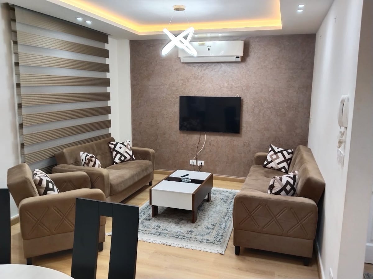 Fantástico apartamento totalmente amueblado de 3 dormitorios dobles grandes, ubicado en New Cairo, a 25 metros del aeropuerto internacional de El Cairo. Aeropuerto en una hermosa villa con entrada privada en una zona muy prestigiosa donde los huéspedes pueden relajarse y disfrutar del ambiente egipcio. Cuenta con una amplia y bonita sala de estar, cocina totalmente equipada, balcón grande con vistas al paisaje, una habitación principal con cama tamaño queen con baño privado y ducha. Los otros 2 dormitorios tienen 4 camas individuales, un baño grande y una bañera.