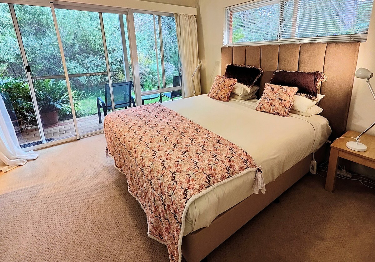 Cada una de nuestras 4 lujosas suites de 4,5 estrellas con cama tamaño king tiene su propio baño con bañera de hidromasaje doble, ducha grande, inodoro separado y está escondida en un hermoso bosque nativo. Wifi gratuito, TV por streaming y desayuno continental gourmet incluido. Las grandes ventanas y la puerta corrediza de vidrio conducen a un patio con vistas a un hermoso jardín y un bosque prístino. Amplia sala de estar común, chimenea y TV de pantalla grande + zona al aire libre con vistas al bosque. Escápate, relájate, disfruta, revive y rejuvenece en un lujo moderno :)