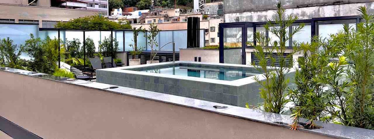 Copa Garden , un apartamento único para aquellos que aman estar bien ubicados y no renuncian a la belleza y la comodidad . Tiene un jardín tropical privado, donde podemos revitalizarnos después de las costas de las playas y las noches de Río de Janeiro. A 7 minutos del icónico hotel Copacabana Palace y a 1 minuto del metro , está vigilado entre calles exclusivas con seguridad privada en el corazón del barrio . Hermoso , encantador y bien equipado , en un edificio completamente nuevo, con espacio de coworking y lavandería compartida.