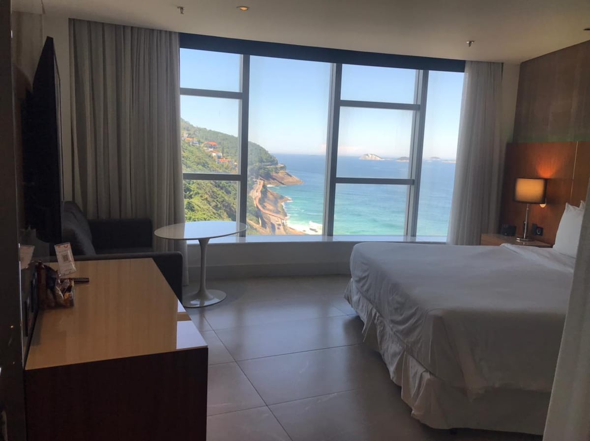 ¡Disfruta de esta espaciosa suite ubicada en el sofisticado Hotel Nacional diseñado por el renombrado arquitecto Oscar Niemeyer! Tiene una vista lateral del mar, una cama tamaño súper king y puedes agregar una cama adicional, baño, ropa de cama y toallas cómodas, un escritorio y un sofá. Las comidas y el estacionamiento se pagan por separado. ¡El famoso restaurante Masi se encuentra dentro del hotel! ¡La fiesta de Nochevieja cuenta con la famosa cascada de fuegos artificiales que desciende desde la parte superior del hotel! ¡Simplemente impresionante! 😍